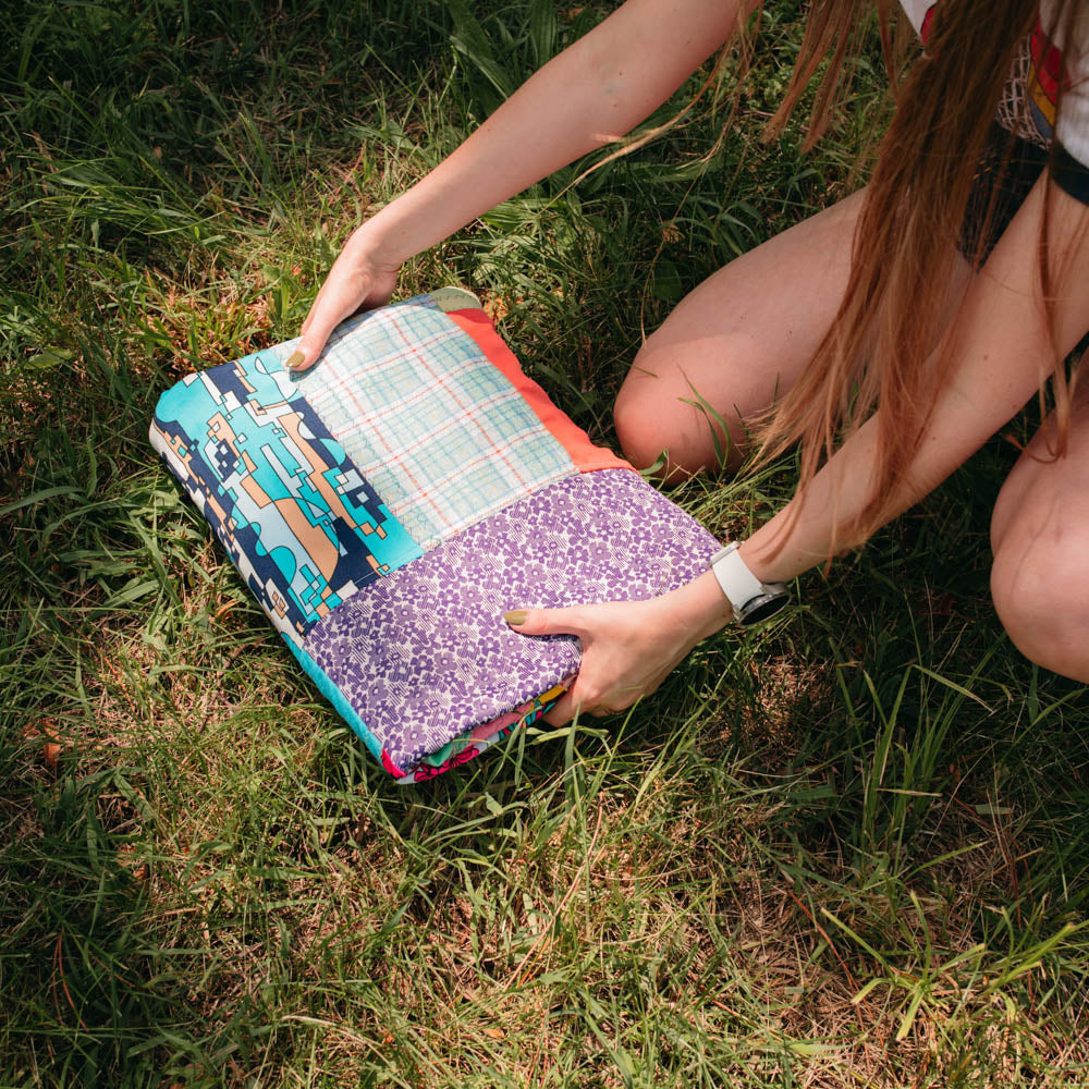 These blankets are lovingly handmade from scraps of double-knit polyester and backed with a large piece of double-knit or similar durable polyester fabric. The two layers are tacked down in a few areas to hold the front and back together. Each one is unique and a lot of care has been put into producing a durable final product for all of your festival, picnic, or spontaneous road trip adventures!