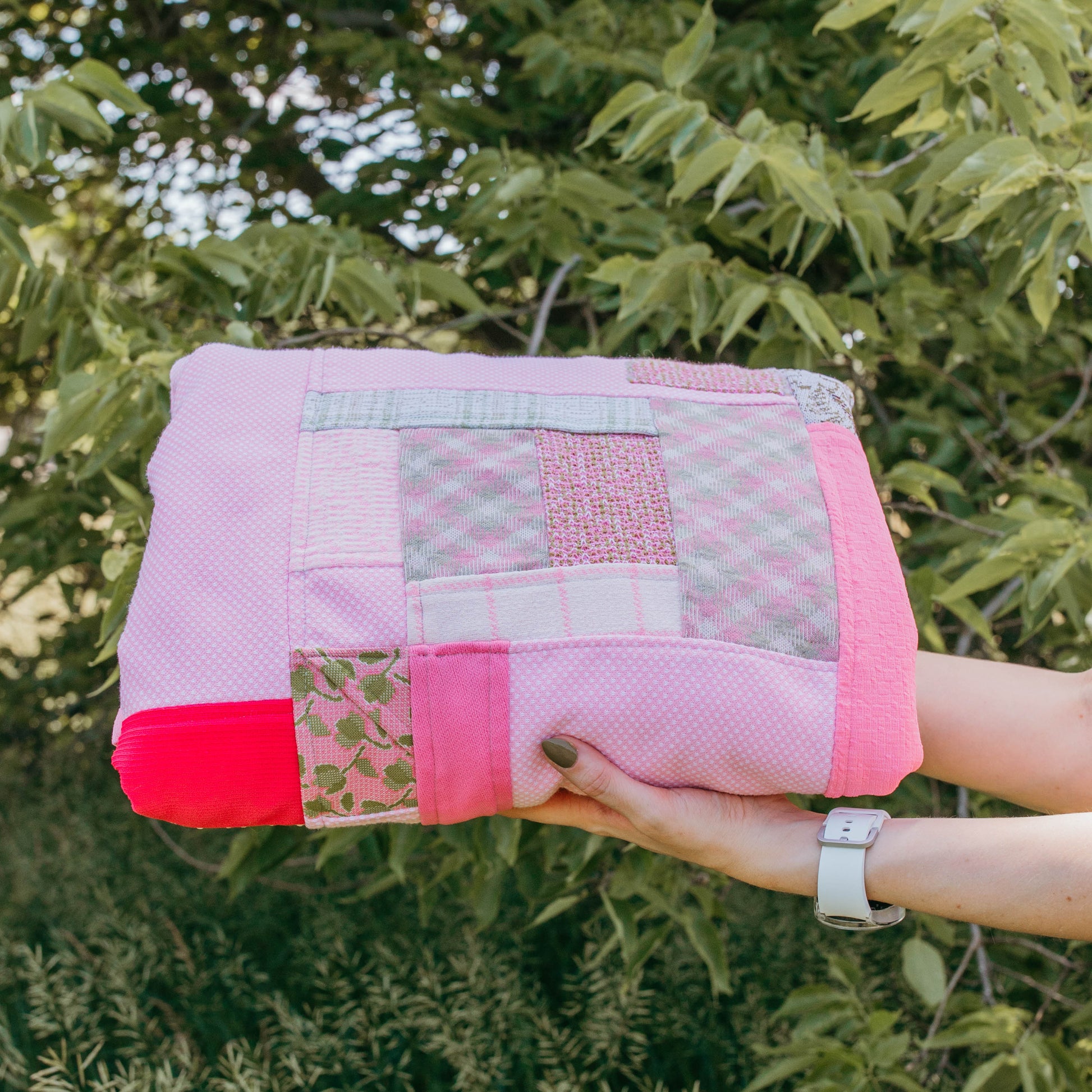 These blankets are lovingly handmade from scraps of double-knit polyester and backed with a large piece of double-knit or similar durable polyester fabric. The two layers are tacked down in a few areas to hold the front and back together. Each one is unique and a lot of care has been put into producing a durable final product for all of your festival, picnic, or spontaneous road trip adventures!